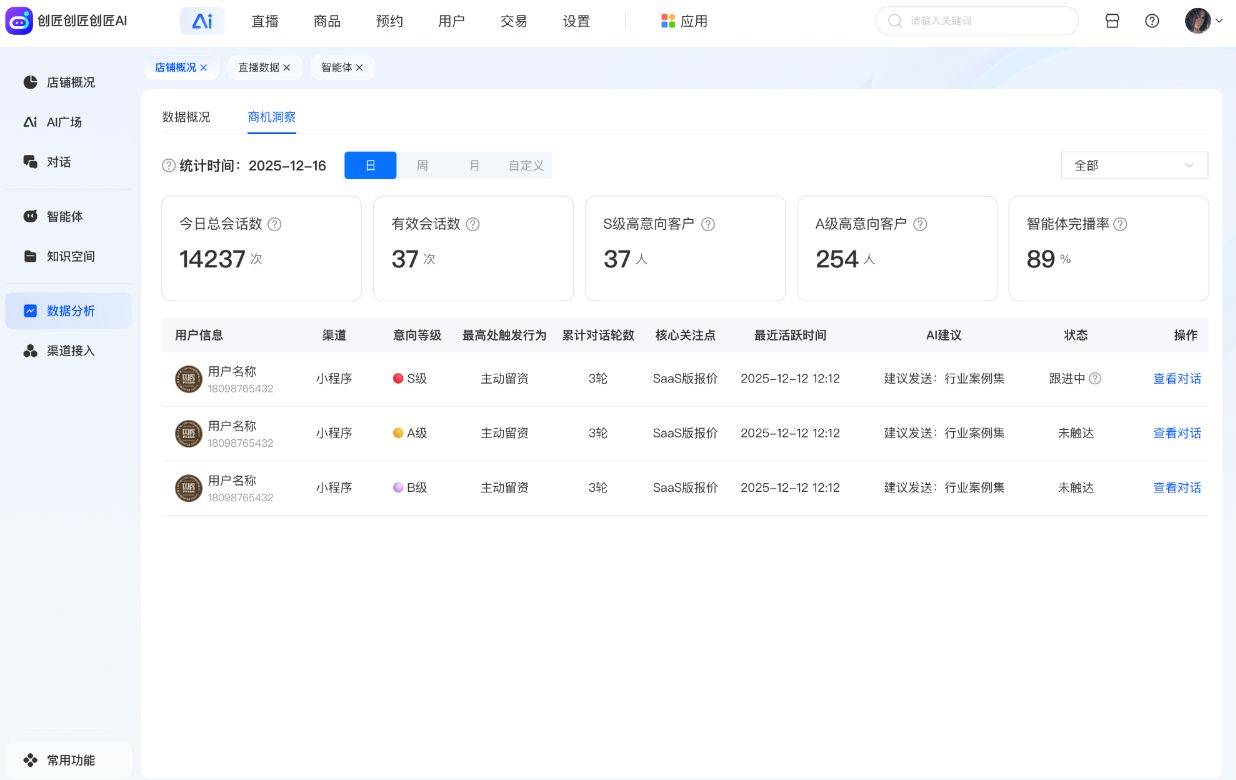 升级最大的亮点之一是赋予了AI智能体“决策级”数据分析能力。系统不仅能全面呈现智能体的对话趋势与使用情况,更能通过AI模型自动识别对话中的高潜力客户(S级/A级),并精准提炼用户的真实关注点与核心需求。同时,系统会为销售与运营团队提供清晰的跟进与转化建议,将海量对话数据转化为可行动的商机洞察,助力团队实现精准营销与高效转化。